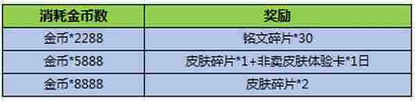 活动期间每日累计消耗金币达指定数目,即可获赠铭文碎片、皮肤碎片、非卖皮肤体验好礼;