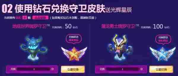 钻石 可以兑换 珍稀守卫皮肤 ,同时获赠 光辉星辰