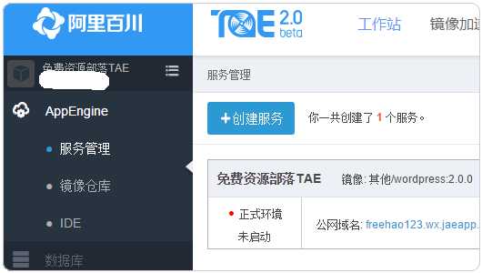 1、进入到TAE管理中心,在“AppEngine”下的“服务管理”可以看到自己已经创建的TAE应用。