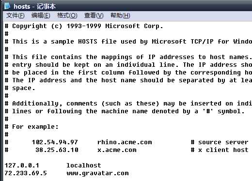 记事本方式打开hosts文件(默认位置为:C:\Windows\System32\drivers\etc),在最下方添加一行:72.233.69.5 www.gravatar.com