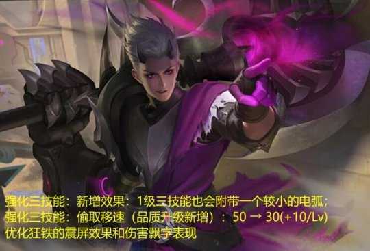 1、狂铁加强。在体验服,狂铁也完成了小重做了,这也是狂铁重做之后的首次调整了,而此次调整,主要是三技能,新增1级三技能也会附带一个较小的电弧的效果,同时偷取移速(品质升级新增)削弱前期加强后期:50 → 30(+10/Lv)。狂铁在重做之后,在体验服的表现还是不错的,在上线正式服之后,估计也会成为新的边路霸主了。