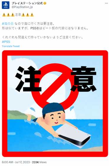 今天是日本的海之日,PlayStation日本发文提醒玩家:去海边的要注意了,虽然形状相似,但PS5不能代替游泳用的浮板,千万不要拿错了。