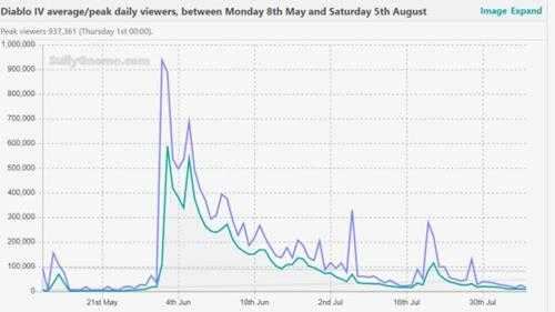 据PCGamesN使用直播平台收视率统计工具分析,《暗黑4》抢先体验阶段在Twitch直播的观众峰值达到了937361人,正式发售日为686936人。然而,到了8月7日,其观看人数已经降至13601人。发售仅仅两个月,其观众人数已经跌到只有巅峰时期的1.45%。