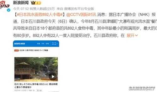 据新浪新闻报道,日本广播协会(NHK)消息,日本确认:8月石川县“流水面”事件共致892人食物中毒,泉水中检测出弯曲杆菌。