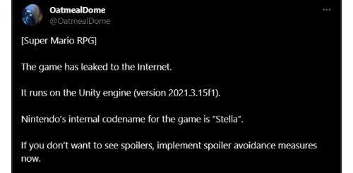 《超级马里奥RPG:重制版》本定于11月17日发售,但目前游戏已经遭到偷跑,剧透开始在社交媒体上流传,其背后的开发商以及开发引擎也已经泄露。